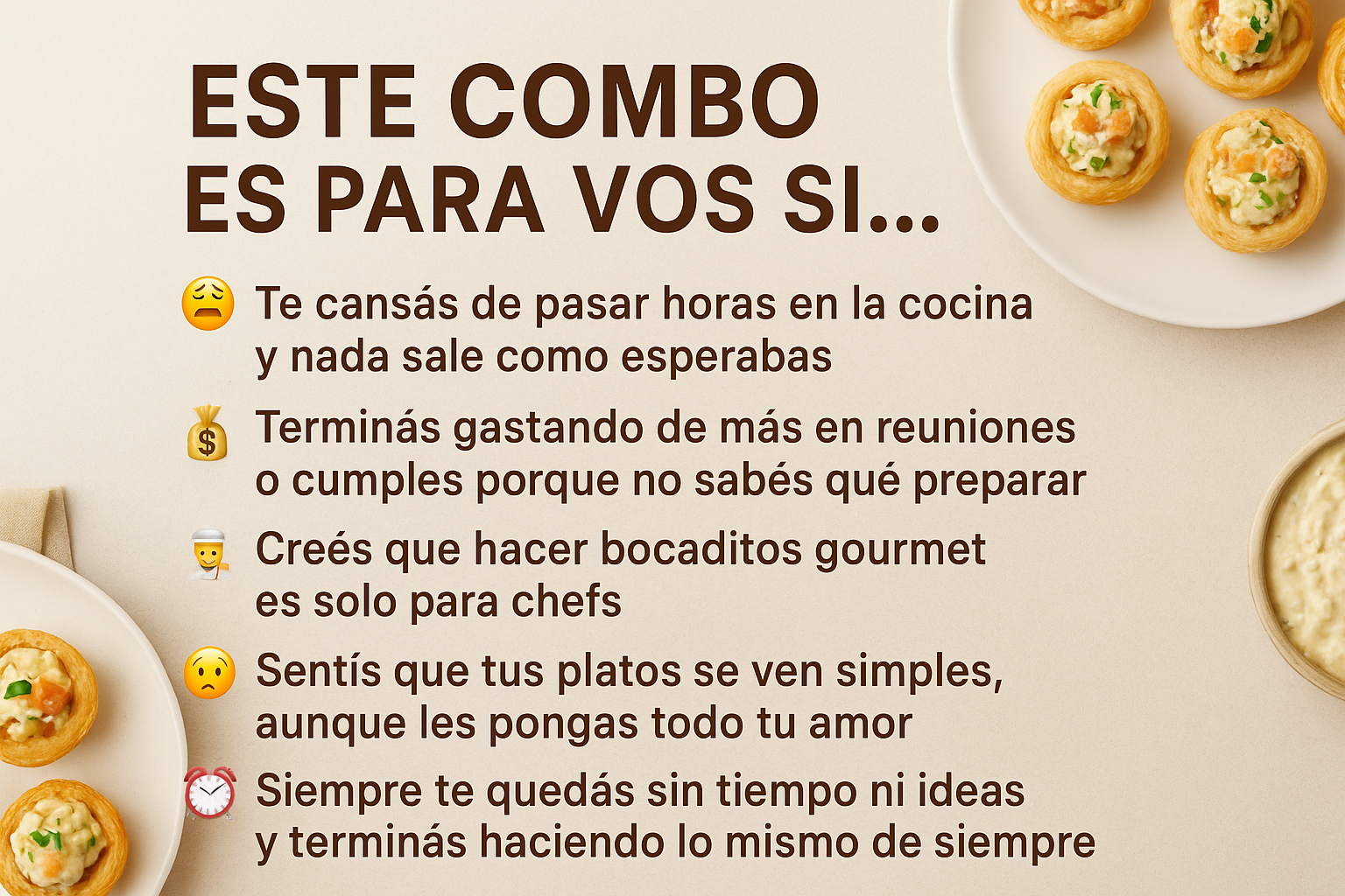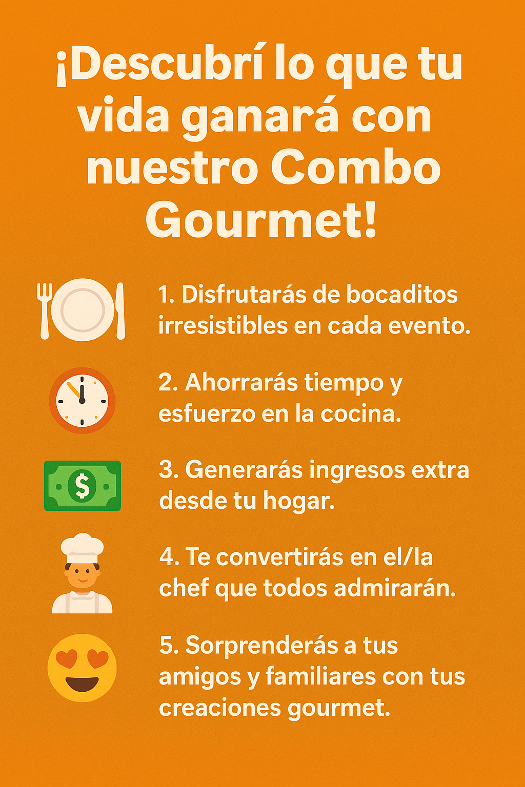 “Con más de 160 recetas probadas y detalladas, sabemos que el Combo Gourmet transformará tu manera de cocinar y organizar eventos. Pero si después de probarlo no sentís que mejoró tu experiencia en la cocina, te devolvemos tu dinero. Tu inversión está protegida.”